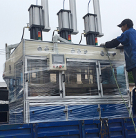 产品特点: 三几台一体设计,可适配单模具(正面操作),或者长模具(侧面操作) 加热冷却一体型热板 可拆卸式冷却管路 人体工程学操作高度 快速升降油路 电子尺设定模具高度 四周带自动安全防护门 机台内配置照明灯 大屏幕显示器设定 高精度温控表,无触点继电器控制加温 大口径冷却管路 特殊设计防堵冷却管路 多段温,多段压控制程序 异常报警信息显示 技术参数: A.主机构成 1.主机型式: 四柱式,三缸,三组热板,自上往下型式,控制柜在机器右侧。 2.锁模力: 30tonX3 3.油缸型式: 3 X 30ton油压缸 4.最高压力: 17Mpa 5.液压缸缸径: f150mmX3 6.液压缸最大行程: 420mm 7.热板间距: 400mm 8.热板尺寸: (正面宽)800mm X (前后)600mm (可组合为2400mm) 9.层数: 单层 10.主要材質: 钢板(Q235A) 11.热板: Q235A(带电加热与水冷却管路),本机台共有6块加热板 12.主机框架: 选用80X80&80X40工业型材制作。 13.单机正面有效宽度430mm,侧面有效宽度600mm. 14.下热板上平面离地高度1米。 15.快速升降速度: 50mm/sec 16.慢速升降速度: 5mm/sec(可调) B.油压系统 1.系统构成: 单泵快速缸油路(可升级伺服液压系统) C.电气系统 1.系统构成: 可编程控制器+触摸屏+温控表组成,程序控制为多段压,多段温,自动控制 7.电热部分: 单热板采用左右分区控制,单区采用三相星型接法, 本机台共有6块加热板,12个分区。 8.冷却系统: 单热板口径3/4,配进水电磁阀控制。(冷却水用户自备) D.外表涂装 1.主机门板: RAL5002(群青兰)2.控制柜: RAL7035(浅灰色) E.安全与防护 1.主机部:主机四周配备安全防护门(有机玻璃门),开门锁定无操作。 2.电控部:系统配备急停开关,故障报警灯。 F.特殊说明 外置式电控柜 |
